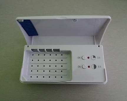 Chaque soir, déposez vos aides auditives dans la boite et lancez le cycle de séchage+désinfection. L’air est régulièrement réchauffé grâce à un dispositif électrique et un mini-ventilateur dans un compartiment hygiénique. Ainsi, vos appareils auditifs seront débarrassés de façon douce de l'eau et de la sueur à une température de 45 °C afin d'assurer la protection des parties électroniques. Les UV vont détruire les bactéries présentent sur les appareils et/ou embouts.